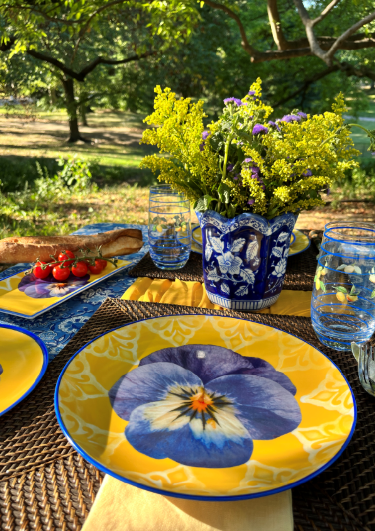 Vibrant colors to bring joy to your table and flowers of course! always makes us happy. Hand Painted with love & art.