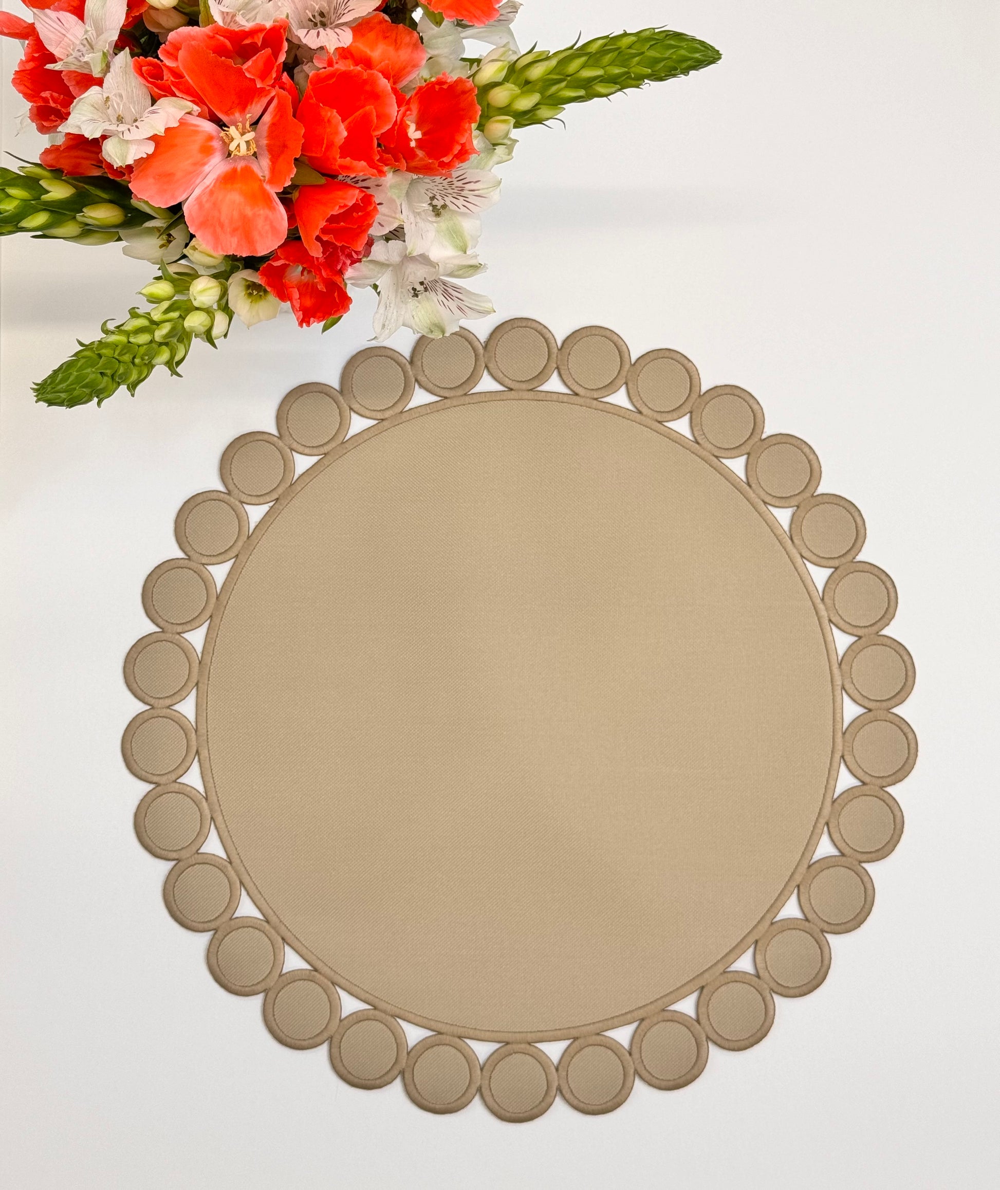 An embroidered placemat in a spheres style is both stunningly beautiful and uniquely captivating, infusing any table setting with its exquisite design and artistic flair.