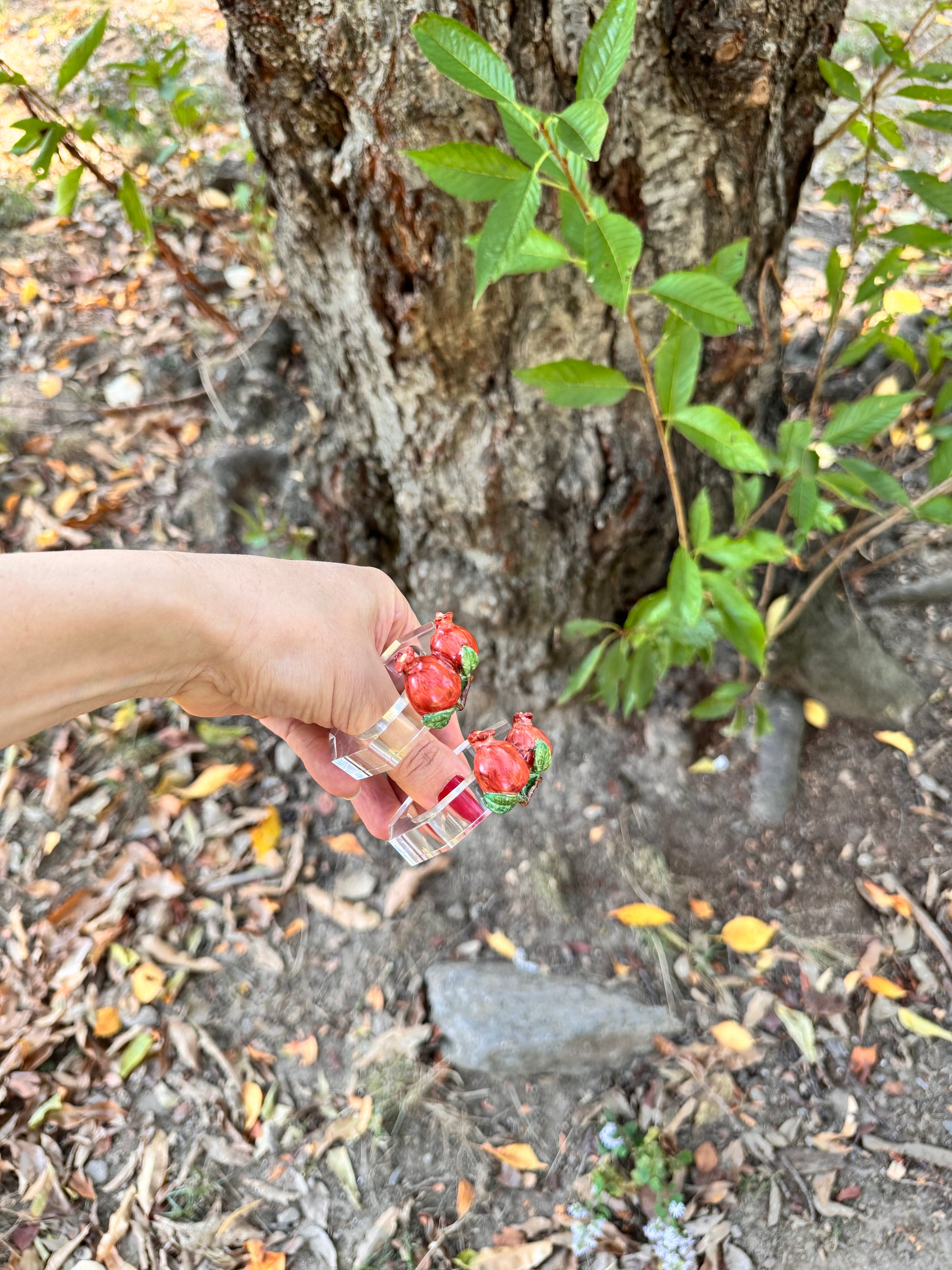The napkin ring is an exquisite piece, elegantly adorned with a hand-painted pomegranate porcelain applique that adds a touch of vibrant charm to any table setting. Set of 2