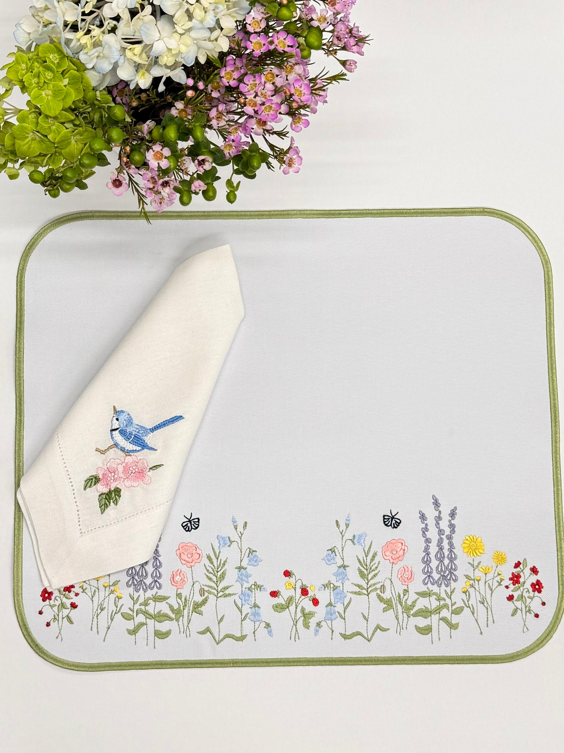 A placemat with a little garden embroidered brings a delightful touch of nature to the table, featuring intricate details of flowers and greenery that evoke a serene and charming outdoor scene.